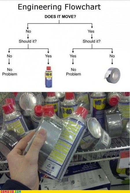 Easily add text to images or memes. Feb 25 2013 engineering flowchart. Ingenieur humor engineer humor hate my job wd 40 duct tape masking tape. Duct tape is a type of cloth backed water resistant tape sometimes coated with a substance such as polyethylene. Caption a meme or image make a gif make a chart make a demotivational flip through images. Press j to jump to the feed. Wd 40 multi use product is not really a lubricant.