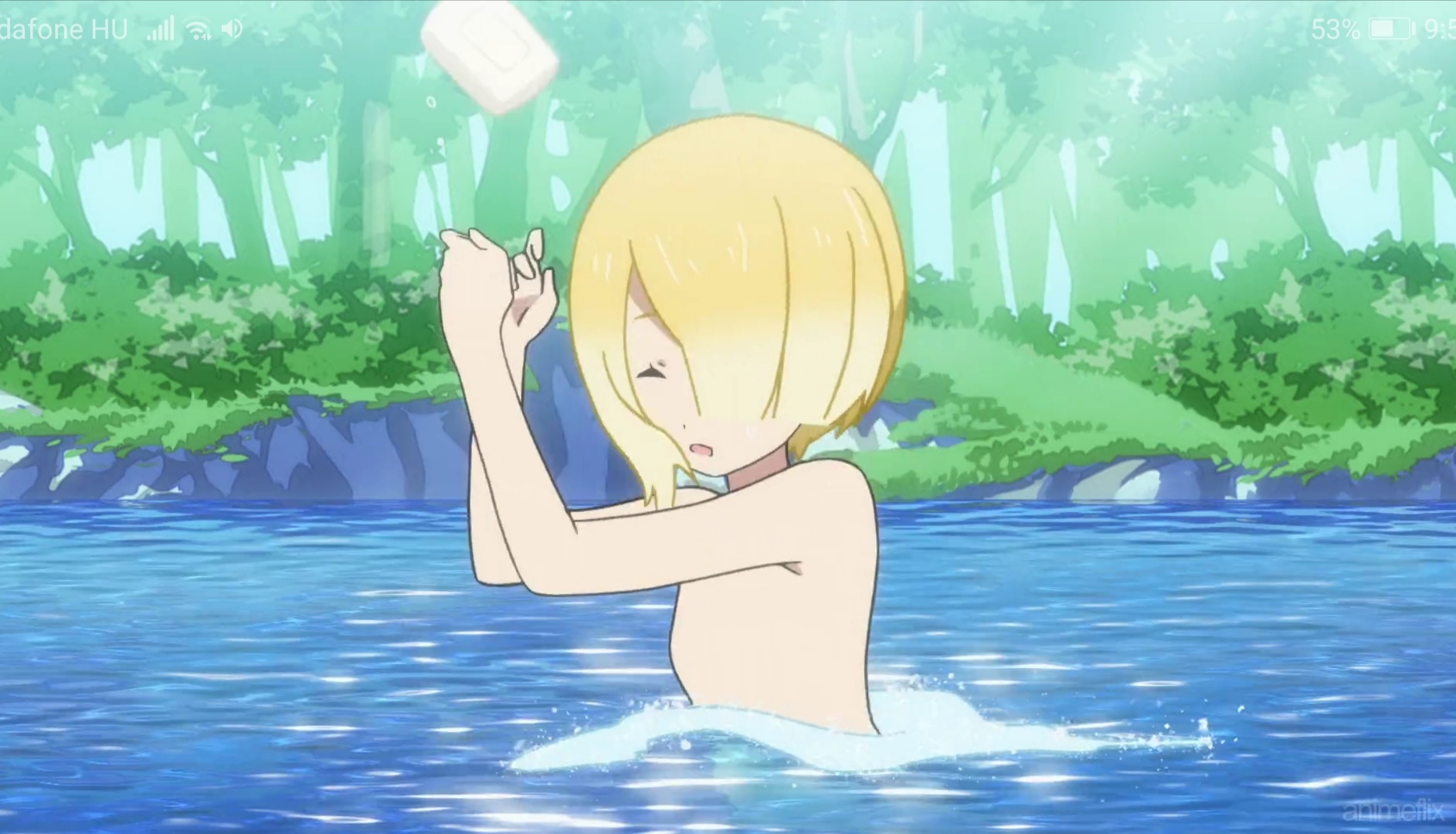 She also has hair clips towards right side of her hair flower shaped ribbon on the same side of her hair and a maid hairband.